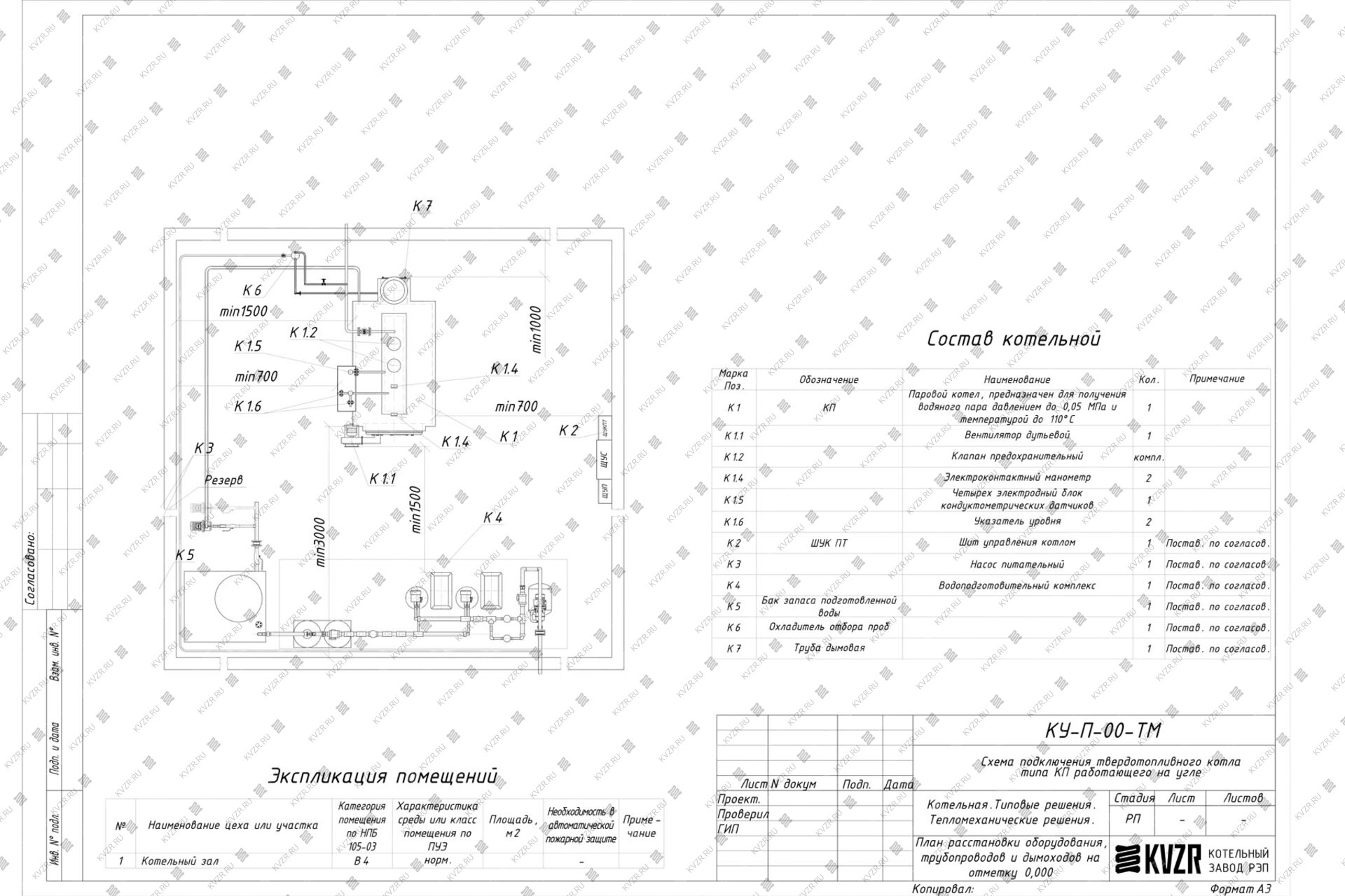 К фронтовой плите крепится воздуховод и вентилятор для подачи воздуха в топку котла под слоевую решетку. На задней крышке котла парогенератора КП 300 в основании дымовой трубы выполнен предохранительный взрывной клапан. Образующиеся в топочной камере продукты сгорания проходят конвективный пучок труб и выводятся через трубу дымовую, установленную на корпусе в хвостовой части котла. При работе круглый парообразователь КП 300 подпитывается водой для образования пара через штуцер. Подпитка котла ведется из питательного бака насосом через соединительную арматуру. На трубопроводе подпитки котла водой должно быть установлено запорное устройство и обратный клапан. Запорное устройство располагается между паровым котлом КПр 300 и обратным клапаном.