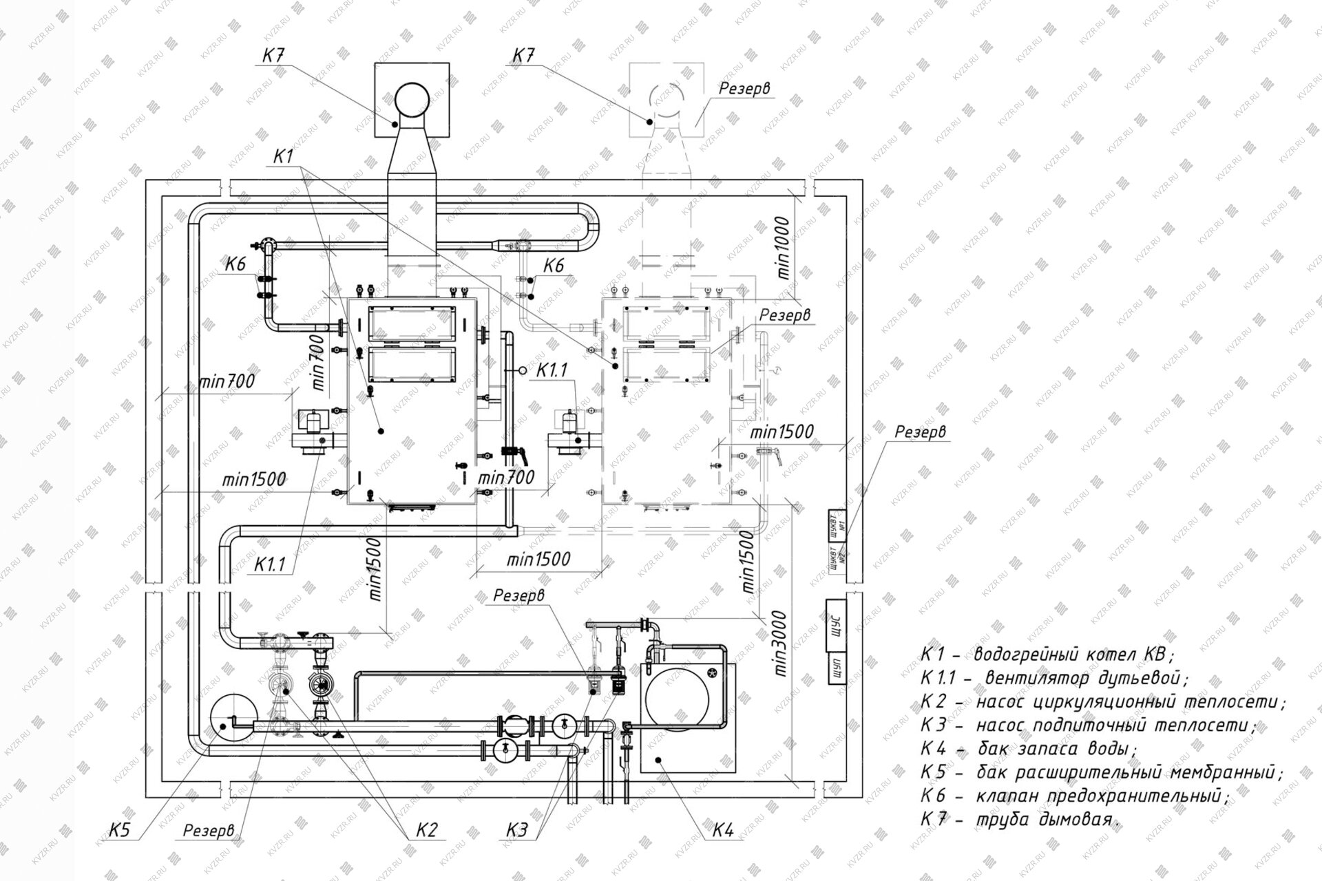 Чтобы правильно подключить котел 500 кВт на естественной тяге в котельной необходимо оставить проемы для обслуживания оборудования во время эксплуатации. На представленной здесь схеме указаны их минимальные размеры. Кроме того, в данной примерной схеме монтажа водогрейных котлов и оборудования указан перечень минимально необходимого вспомогательного оборудования для правильной работы котла.