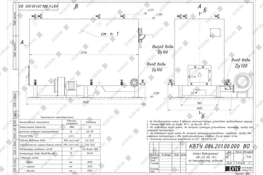 Российские промышленные отопительные котлы предназначены для отопления и горячего водоснабжения жилых и административных зданий и производственных цехов, для работы как в закрытых так и в открытых системах теплоснабжения с принудительной циркуляцией воды. Стальные промышленные прямоточные отопительные котлы унифицированной серии КВ предназначены для установки в котельных как при сжигании газа, дизеля и мазута (тип KBа), так и при сжигании твердого топлива в слое (тип КВр, КВм). Водогрейные котлы обеспечивают подогрев воды температурой до 95 - 115 °С с разностью на входе и выходе 25 °С. Диапазон регулирования нагрузки водогрейных котлов может меняться в пределах 50-100 %, рабочее давление котлов 0,6 (6,0) МПа (кгс/см), температура уходящих газов при сжигании газа до 190 °С, при сжигании мазута до 230 °С и твердого топлива до 200 °С.