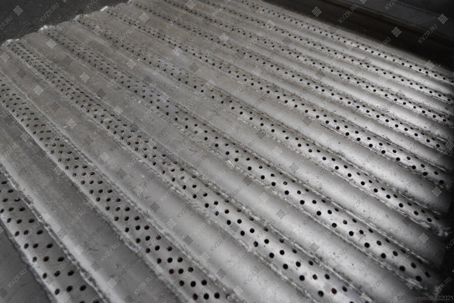 Топка с водяными колосниками котла на гранулах имеет следующую конструкцию – низ стальной топочной части блока используется для слоевого сжигания древесного топлива. Рама топки представляет собой стальные трубы, по которым движется нагреваемая в котлоагрегате вода. Между трубами вварены полосы металла с отверстиями для подачи воздуха в топку. На водяных колосниках происходит сгорание топлива. За счет движения теплоносителя и воздуха трубы топки охлаждаются. Маленькие отверстия в полосе не дают проваливаться в зольник не догоревшему топливу.