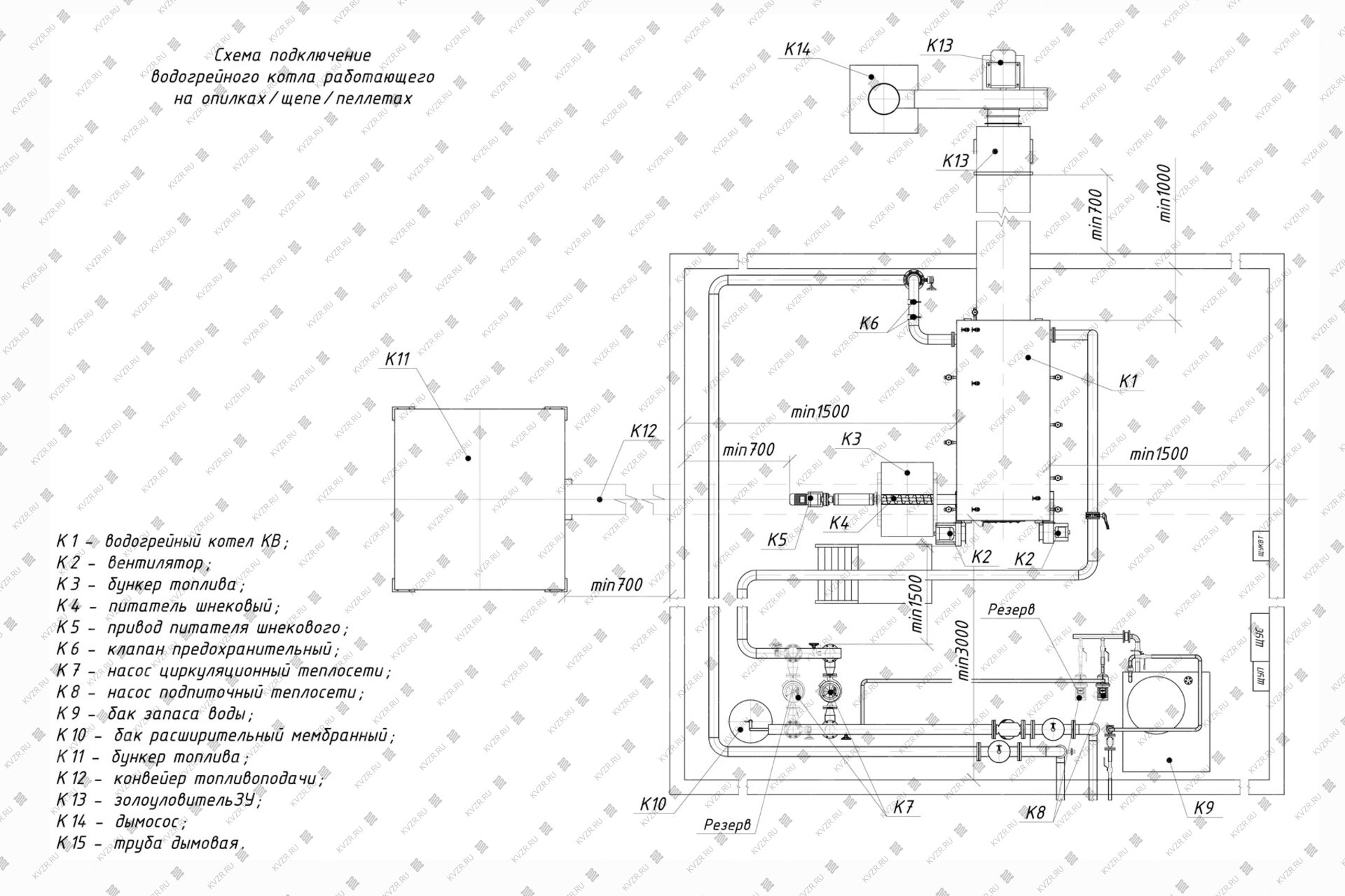 Чтобы правильно подключить котел 300 кВт на опилках в котельной необходимо оставить проемы для обслуживания оборудования во время эксплуатации. На представленной здесь схеме указаны их минимальные размеры. Кроме того, в данной примерной схеме монтажа водогрейных котлов и оборудования указан перечень минимально необходимого вспомогательного оборудования для правильной работы котла.